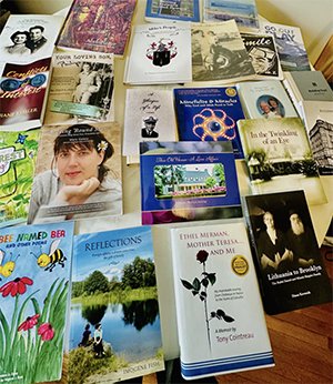 This quote resonates for Leah Broyde Abrahams of Chestnut Hill, MA, a newly inducted member of NAWA. She spent the last 20 years working on her visual art skills, primarily as a photographer, at the same time that she was a ghost for her clients. A ghost? Yes, a ghost writer, editor, and book packager for individuals who wanted their legacy to their family expressed as a memoir. While some of these memoirs were videos, Leah primarily wrote or edited books for individuals, families, authors of children’s books, and authors of short stories. The photo below shows some of her books, several of which won prizes for independent publishing.