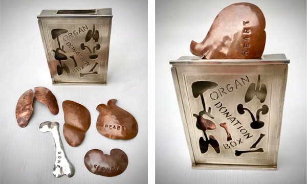 The Organ Donation Box was created from fine-gauge silver pieces and soldered together. The negative images on the front (obverse) were hand-sawed and removed, including the title. The piece measures 4.5”x 3.5”x 1”. The donated organs were cut out and rendered in repoussé (hammered over a form) to create the shapes. The lungs, heart, kidney, and liver were made of copper, and the bone was silver. The organs range in size from 2” to 3”.